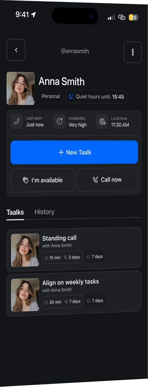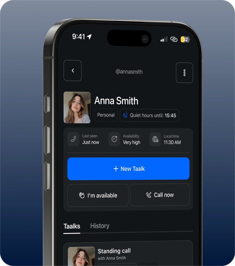 Request a call, see availability, know who is calling, and let Taalk connect you — without blocking calendars or back-and-forth.